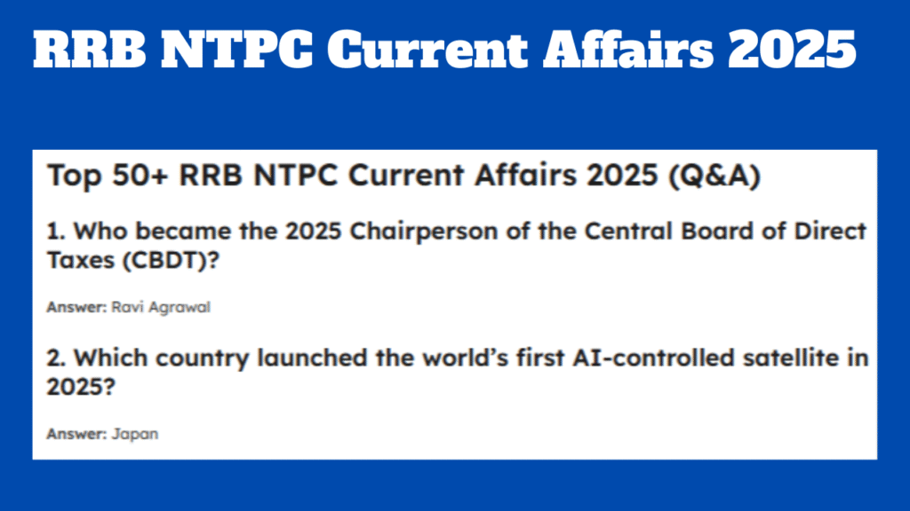 Current affairs play a major role in scoring high marks in RRB NTPC 2025, especially in the General Awareness (GA) … Continue reading RRB NTPC Current Affairs 2025 – 50+ Most Important Questions & Answers for Exam Preparation (English)